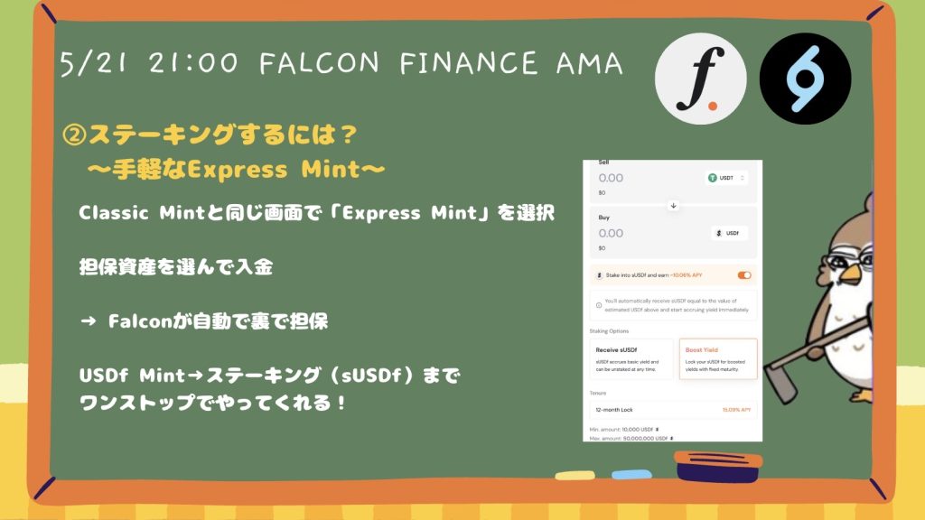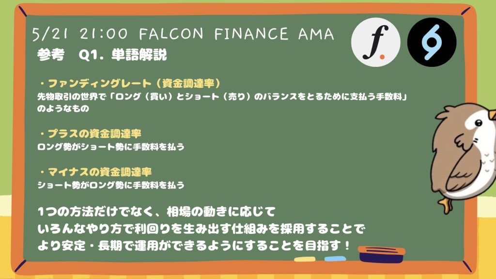 今回のAMAでは、USDf/sUSDfの仕組み、Boosted Yieldによる高利回り戦略、保険基金を含むリスク管理体制、そして今後予定されているDeFiプロトコルとの連携やFalcon Milesプログラムの拡充について伺いました。