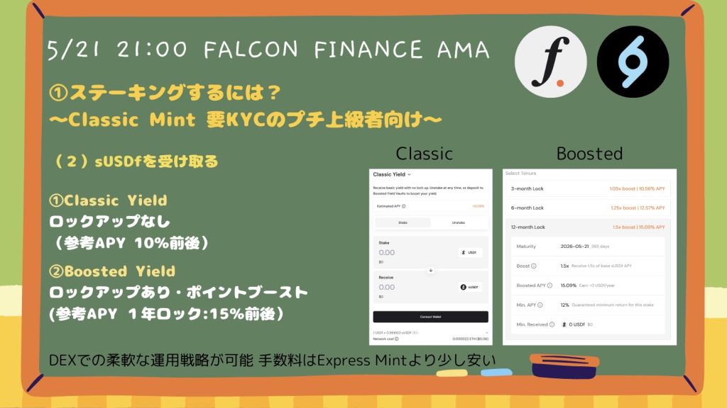 一方のExpress Mintは、USDfを発行すると同時に、自動的にsUSDf(利回り付きトークン)としてプロトコル内にステーキングされる仕組みです。つまり、「USDfのミント」と「利回り運用の開始」がワンステップで完結する利便性の高い機能です。これにより、ユーザーは煩雑な操作を挟むことなく、Falcon Financeが提供するClassic Yield(年率二桁台のAPY)を即座に享受できます。さらに、Boosted Yieldと呼ばれる3ヶ月・6ヶ月・12ヶ月といった固定期間ステーキングのオプションを選択すれば、通常よりも高いブースト利回りを得ることも可能です。