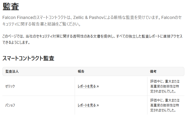 Falcon Financeのスマートコントラクトは、ZellicとPashov Audit Groupという2つの外部監査機関によって安全性の確認(監査)が完了しています。監査の内容や、保有資産の裏付け(準備資産)の証明は、公式の「透明性ページ(Transparency Page)」で誰でも確認できます。