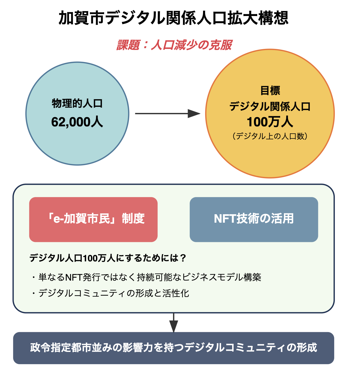 この実現にはNFTの活用が不可欠ですが、単に100万枚のNFTを発行するのではなく、持続可能な形で関係人口を増やすビジネスイノベーションが求められます。従来のNFT市場でも前例のない挑戦であり、新たなアイデアやテクノロジーを組み合わせながら、地域活性化の新モデルを構築し、加賀市の未来を切り開いていきます。