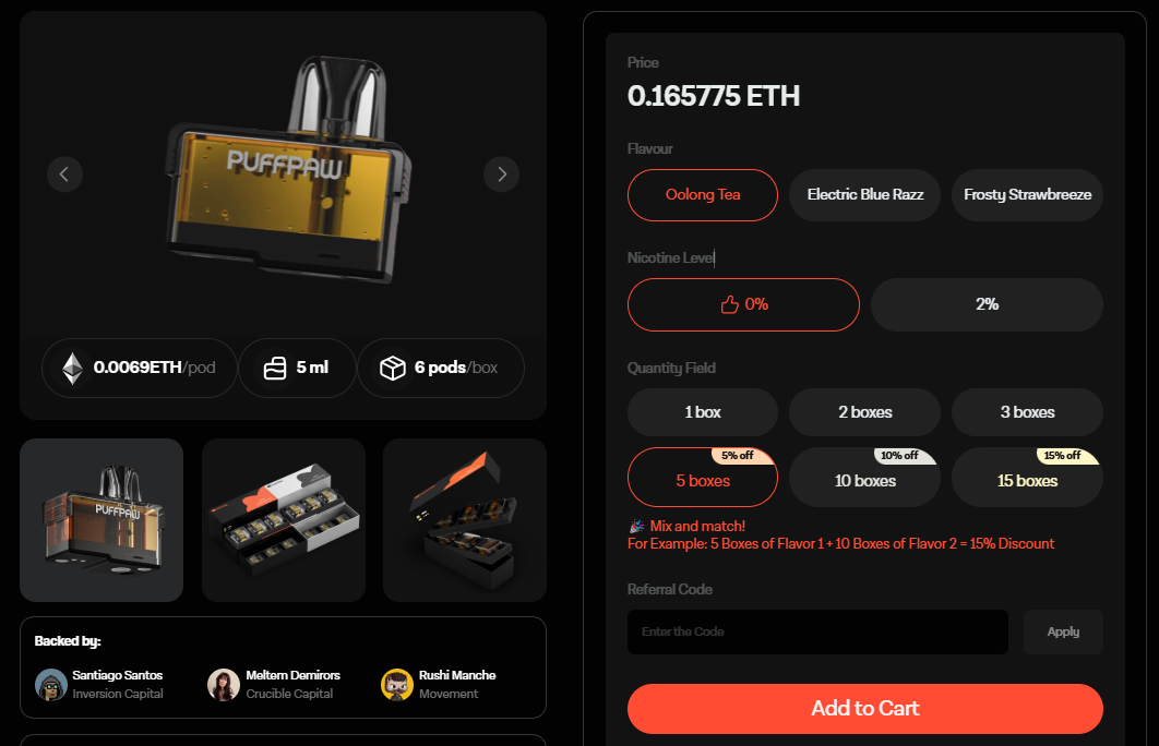 また、Puffpawは有名プロジェクトともコラボレーションしており、例えばPudgy Penguinsデザインのベイプがあります。NFT保有者に限らず誰でも購入可能ですが、NFTを持っているユーザーは安く購入できます。