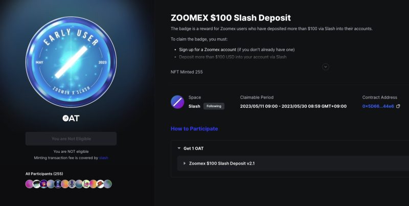 SlashとZoomexのキャンペーンでは、2023年5月30日までGalxeでOATが取得可能です。