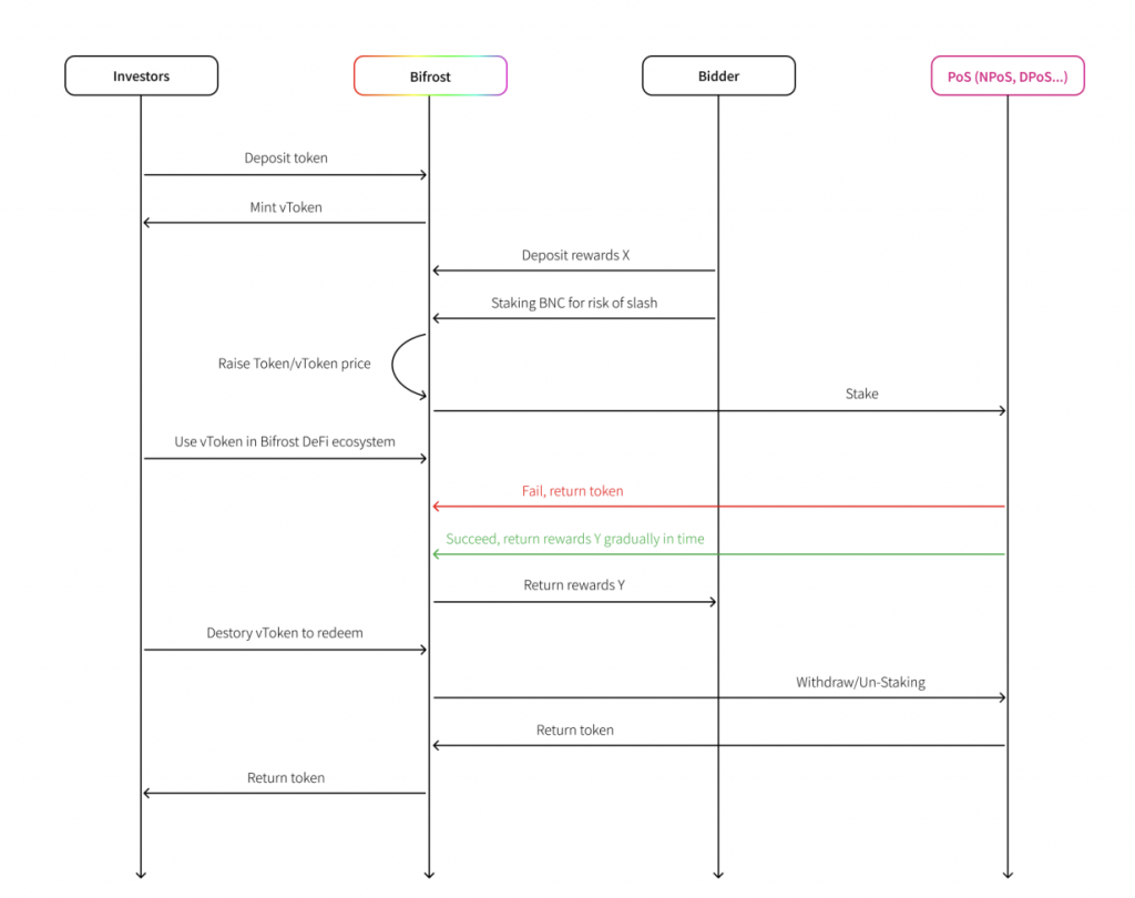 そのため、ユーザーは元のチェーンよりも高いStaking収益を得られるかもしれません。Bidderがこれらの票を獲得した後、Bifrostプロトコルを使ってバリデータに投票し、投資戦略に基づいて利益を得ることができます。