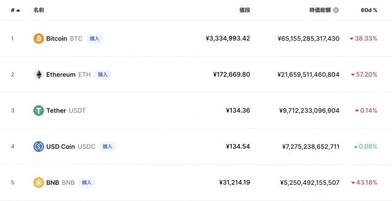 現在、暗号通貨市場では価格下落が続いており、下記画像の通り、上位5通貨の直近60日間のデータを見ても大きく下落していることがわかります。