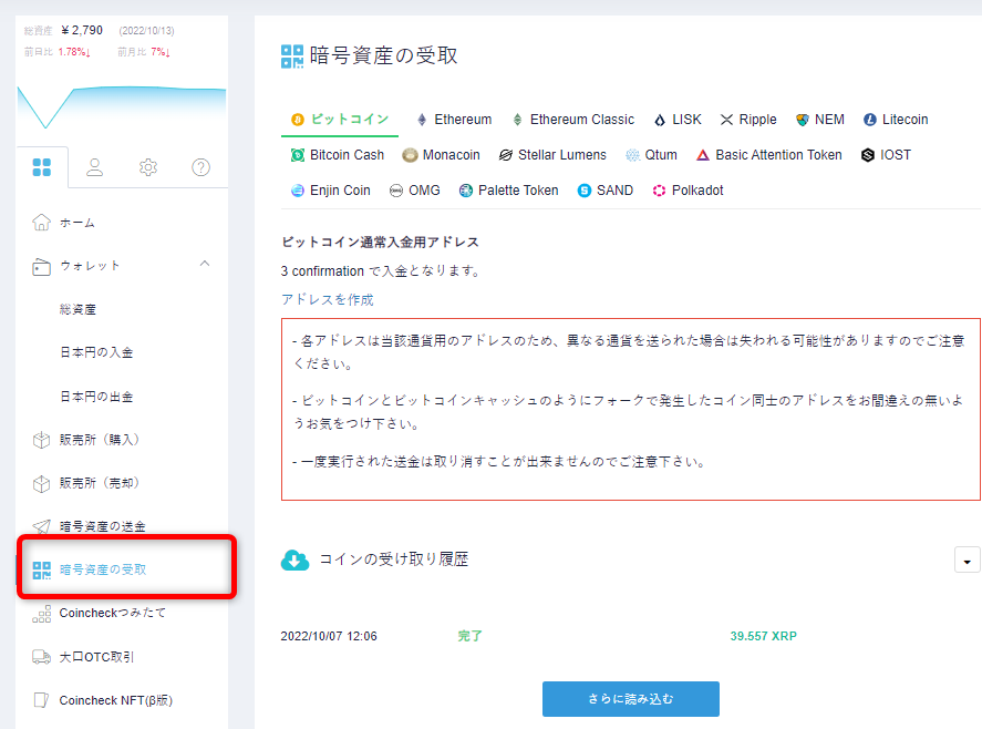 Coincheckへの仮想通貨の入金は、画面左側にある「暗号資産の受取」から進めていきます。