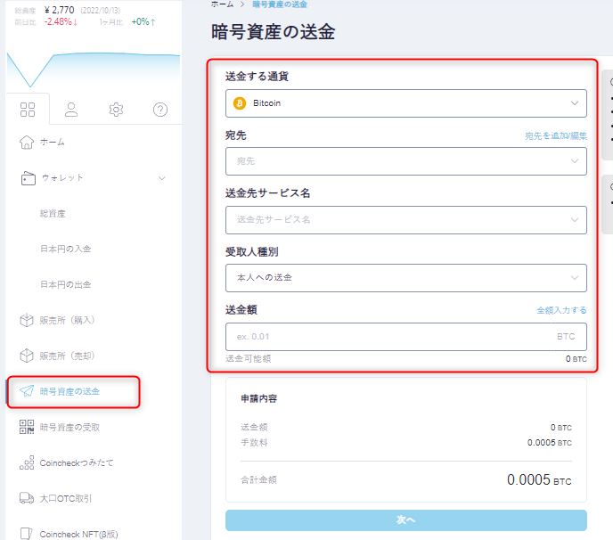 Coincheckから仮想通貨を出金するには、画面左側にある「暗号資産の送金」を選択します。