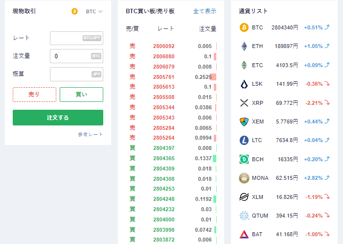一番右側にある仮想通貨一覧から売買したい通貨を選択しましょう。