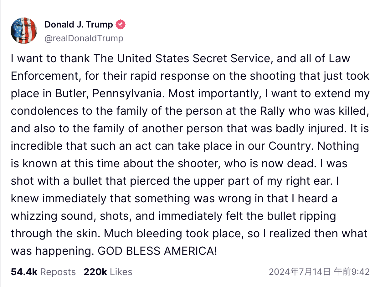 暗殺未遂後のトランプ氏による投稿|Truth Social
