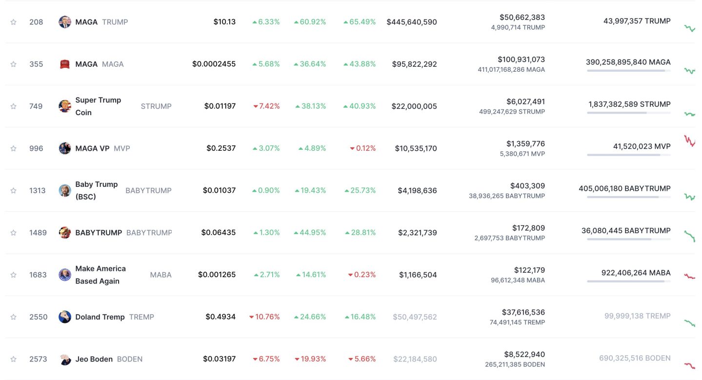 ミームコインの価格は、ソーシャルメディアの感情や現実の出来事に大きく左右されます。トランプ氏は暗号資産支持の姿勢を強調しており、これがバイデン大統領との違いとなっています。