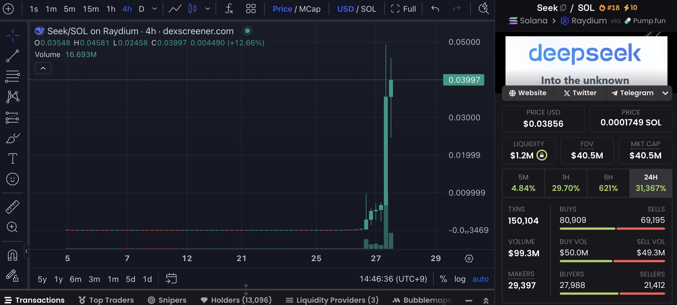 ミームや現実の出来事に基づいて発行される仮想通貨ジャンル「ミームコイン」において、SEEKと名付けられたコインが一時20倍の高騰を記録しました。
