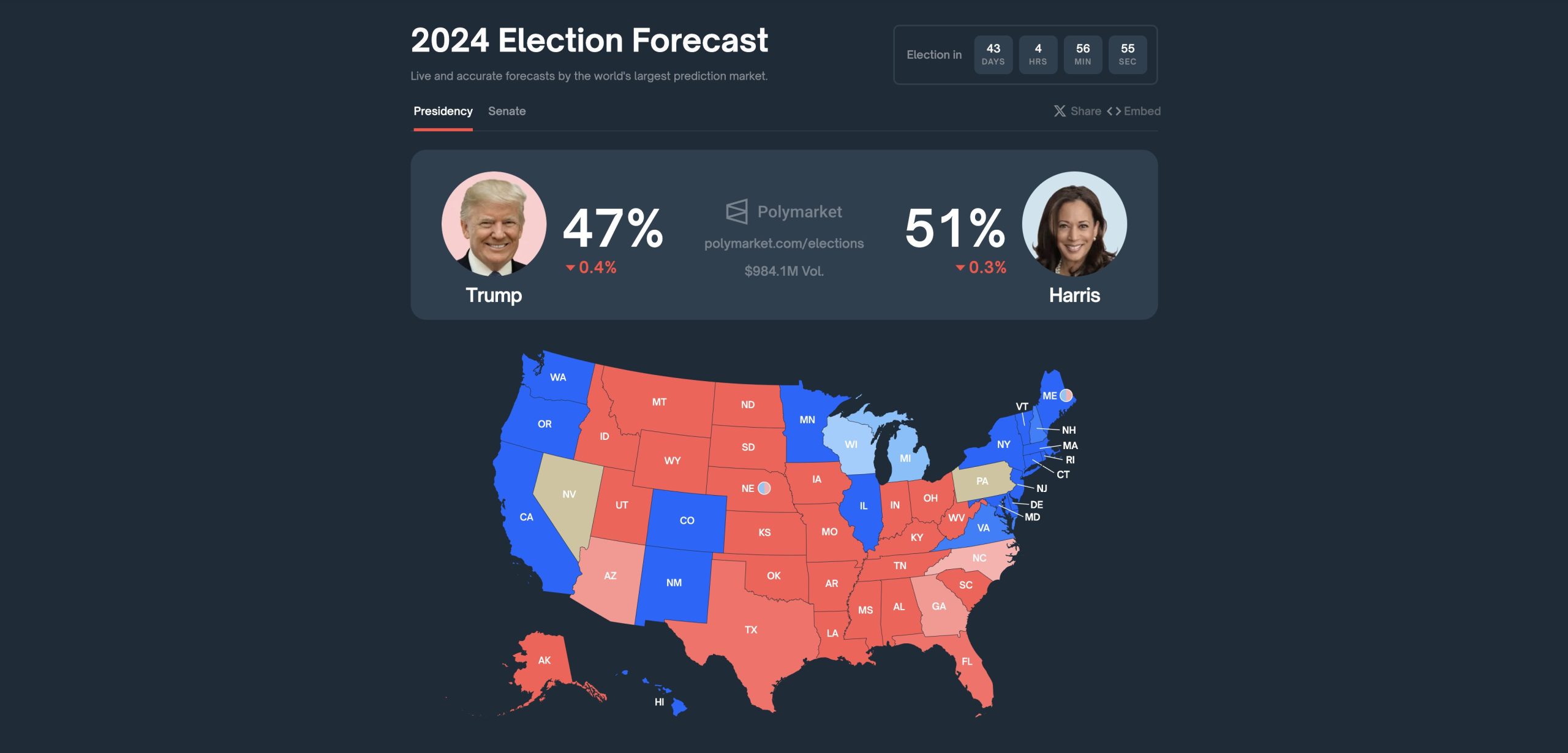 Polymarketによると、ハリス氏が大統領に選ばれる確率は51%に達しています。対するドナルド・トランプ元大統領の勝利確率は47%となっています。