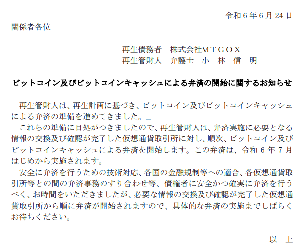 2014年に破産した仮想通貨取引所マウントゴックス(Mt.Gox)は、2024年6月24日、ビットコイン及びビットコインキャッシュによる弁済を7月はじめより開始すると発表しました。
