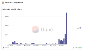 Polygonチェーン上に構築されるPolymarketは、ステーブルコインのUSDCを基軸とし、展開されている様々な予測に対してYes/Noで賭けることができるWeb3プラットフォームです。オンチェーンデータによると、同プラットフォームの取引高は今月に入り急増しており、勢いを増していることが分かります。