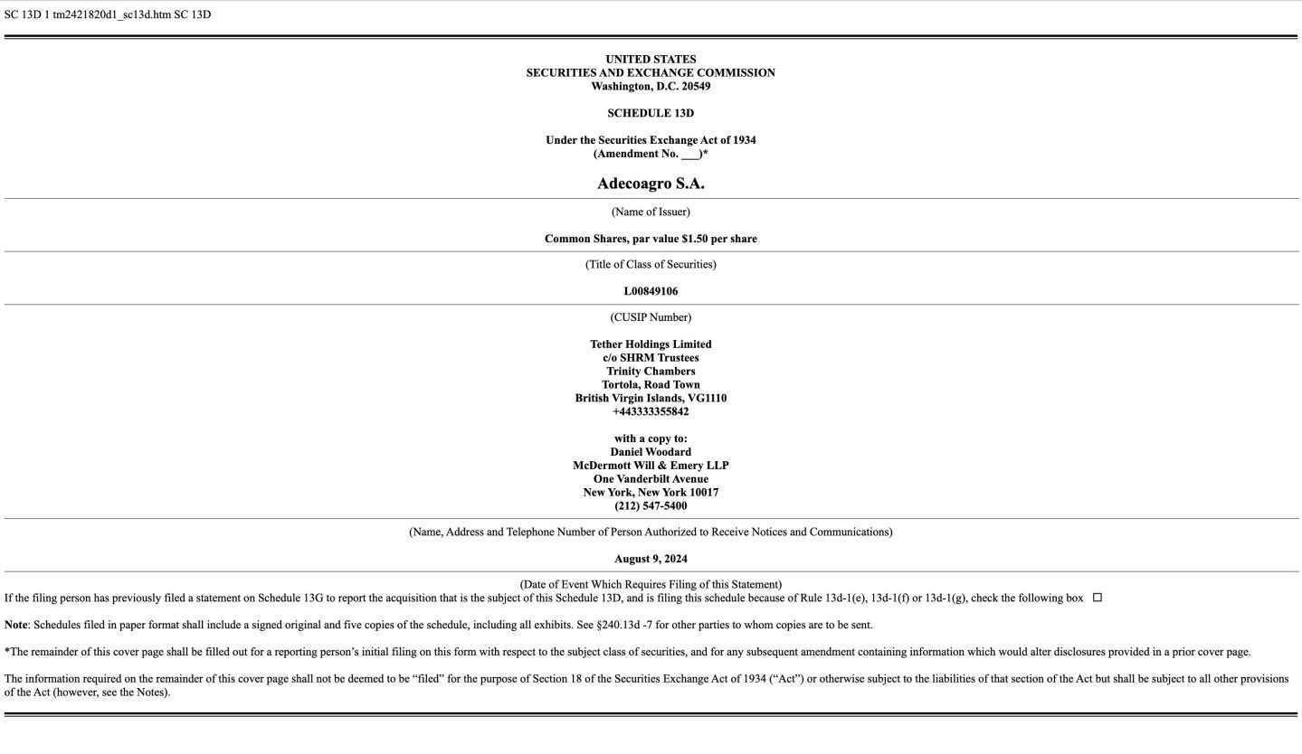 世界最大のステーブルコイン発行企業テザー (Tether) は、新たな投資先として南米の農業大手Adecoagro SAに注目し、7月から8月にかけて約1億200万ドルを投資したことが、SECへの提出書類により判明しました。