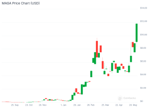 トランプ前大統領をモチーフとした仮想通貨MAGA(ティッカー:$TRUMP)の価格が急騰しています。記事執筆時の時価総額は149位となり、トップ150位以内にランクインしました。今年1月1日からの価格パフォーマンスは約+5,300%となっています。