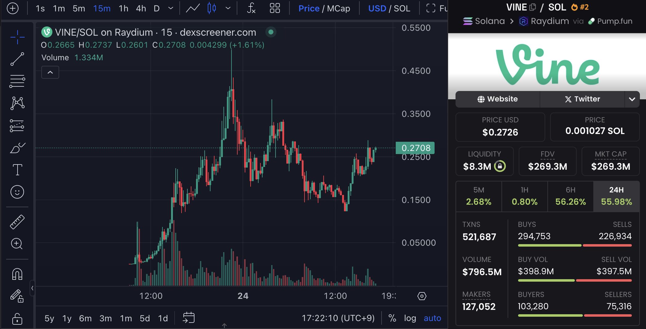 Vine創設者Rus氏公認の仮想通貨(ミームコイン)VINEが、半日で16倍の高騰を記録しました。