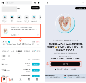 Bitgetスマホアプリのホーム画面に表示される”【当選率100%】2025年初運試し抽選会 ブルガリのジュエリーが当たるチャンス!”をクリック。その後、イベントページの「参加する」を押しましょう。