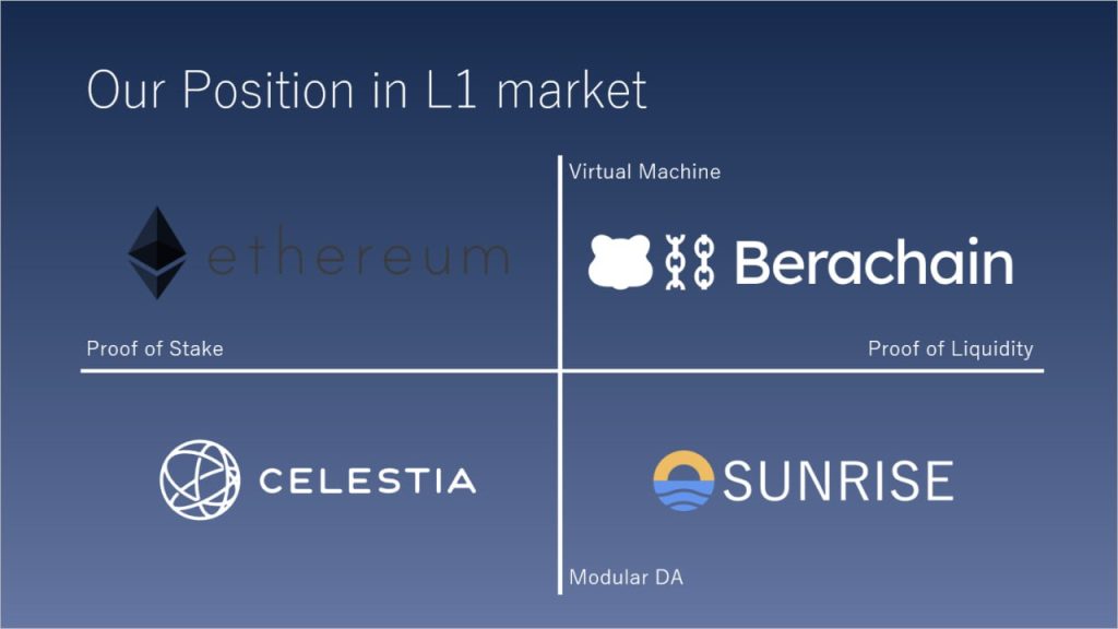 Sunriseは、データ可用性の面ではCelestiaやAvailに似ていますが、仕組みとしてはProof of Liquidityを使っている点でBerachainに近いプロジェクトです。ただし、EVM採用のBerachainと異なり、Sunriseは独自のブロックチェーンを採用しています。