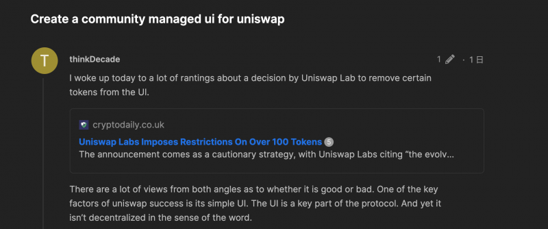 一方で、コミュニティプロダクトの一部であるUniswapのインターフェースに独断で変更を下してしまうことは、少なからずプロダクトを利用するユーザーに対して力を持つことになります。