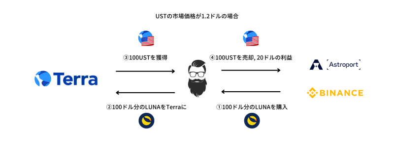 この場合、1ドル相当のLUNAをシステムでBurnすることで1USTを獲得でき、獲得したUSTを市場価格である1.2ドルで売却することが可能です。