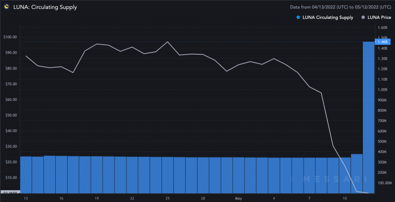 MessariでLUNAの総供給枚数のチャートを確認すると、12.5億枚ほどのLUNAがこのクラッシュにより新規発行されているものの、USTの下方乖離は収まらず、LUNAの新規発行による非常に強力な売り圧を生み出していることがわかります。