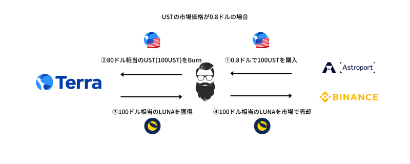 これにより、0.8ドルでUSTを調達する動機が生まれ、UST価格は理論上1ドルに近づいていきます。