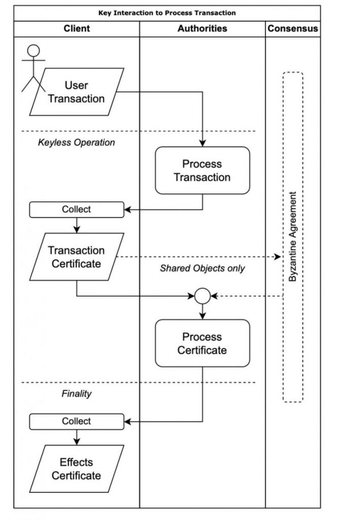 Suiでは、他の要素やアドレスに影響を与えないようなシンプルなトランザクションに対しては、一般的なブロックチェーンで利用されているような厳格なコンセンサスが不要です。